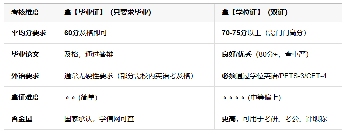 三、 毕业证 vs 学位证 难度对比表