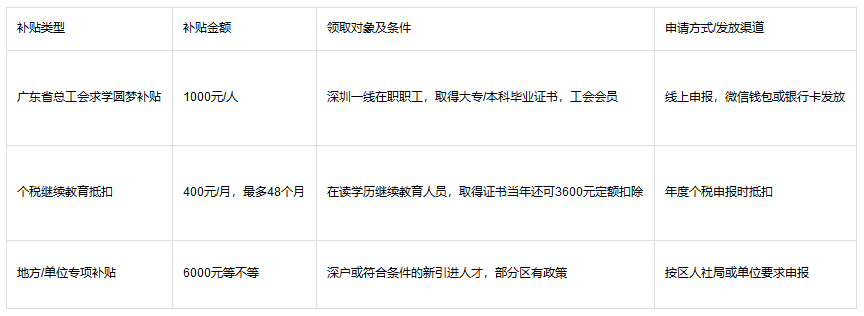 1. 广东省总工会“求学圆梦行动”学历提升补贴(省级政策,深圳适用)。