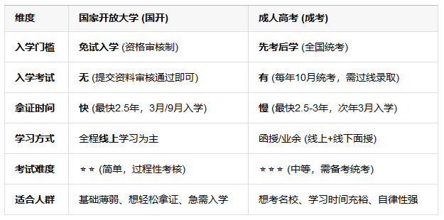 时间优势: 每年有春秋两季入学机会(3月和9月)。比如你现在报名,最快2026年春季就能入学,比成考快半年到一年拿证。