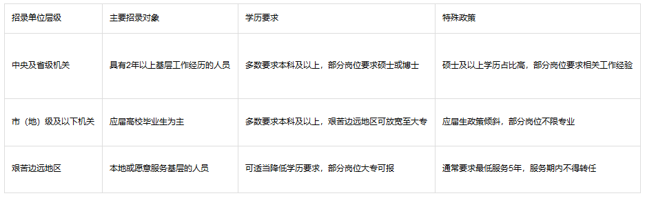 市(地)级及以下机关:本科及以上学历是主流,但艰苦边远地区、基层执法岗位会放宽至大专学历,为更多考生提供机会。