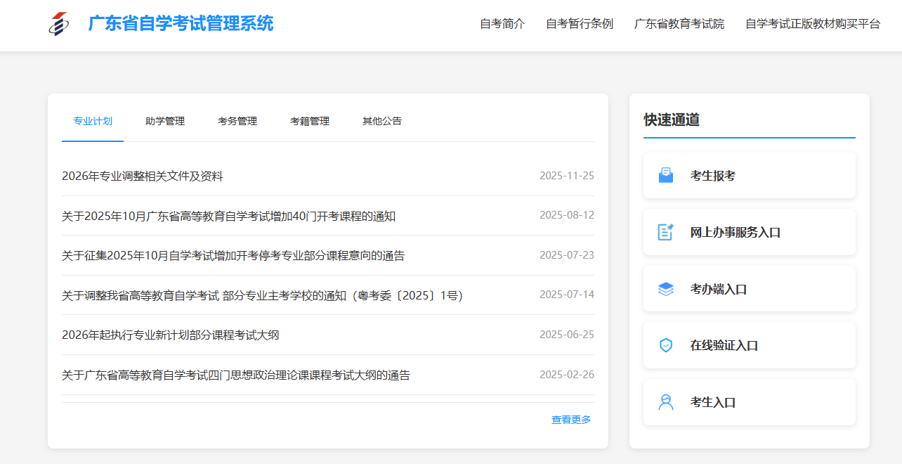 已办理过新生报名手续并取得准考证号的考生,可直接登录广东省自学考试管理系统,根据自身情况选择报考课程。