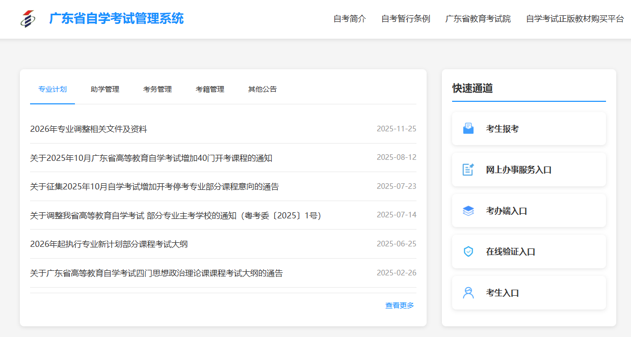 这是广东省自考唯一官方平台,所有报名、报考、缴费、准考证打印、成绩查询等操作均需通过此系统完成。