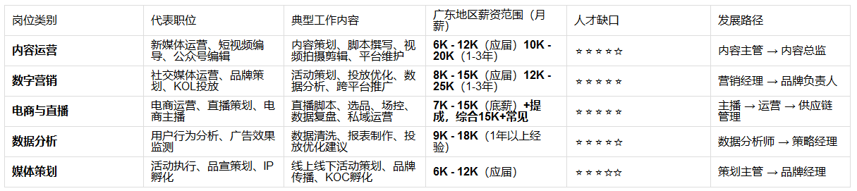 以下是广东地区网络与新媒体专业毕业生主要就业方向及薪资水平(数据综合自智联招聘、BOSS直聘、行业调研):