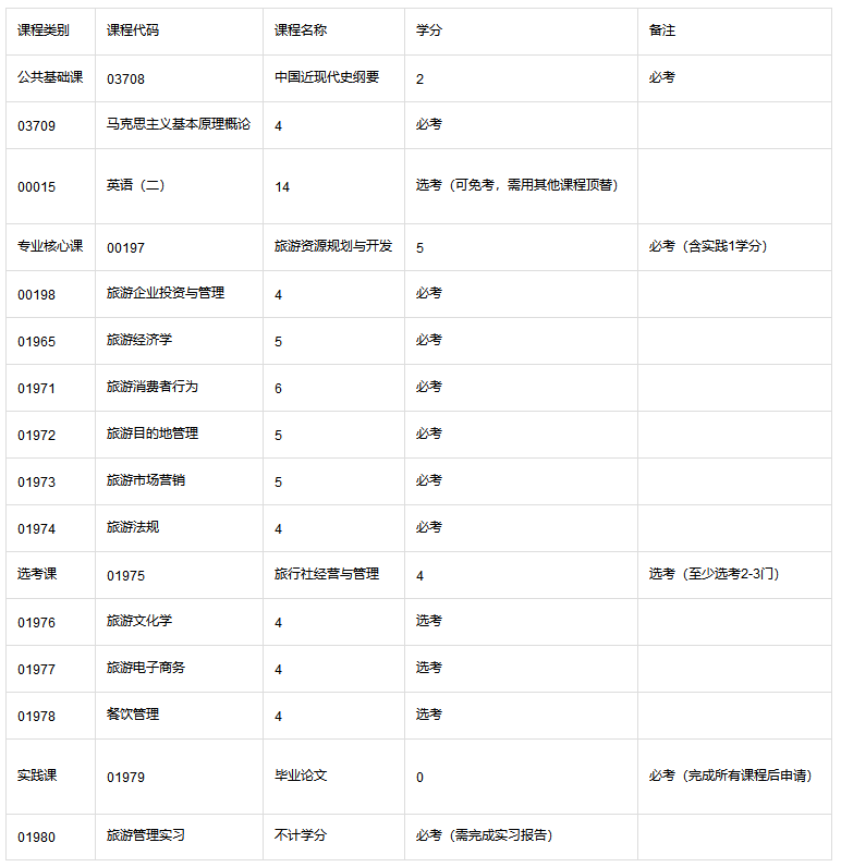 以下为2026年旅游管理自考考试科目一览表,考生可参考制定学习计划(具体科目以报考地教育考试院当年发布的官方通知为准)