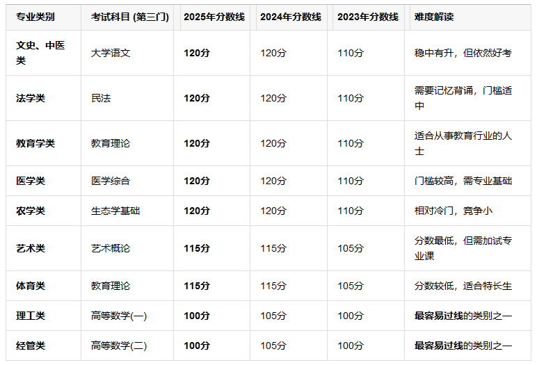 2025年标准:目前最新的2025年数据表明,文史、中医、医学、法学等大类的分数线是 120分,而理工、经管类是 100分。